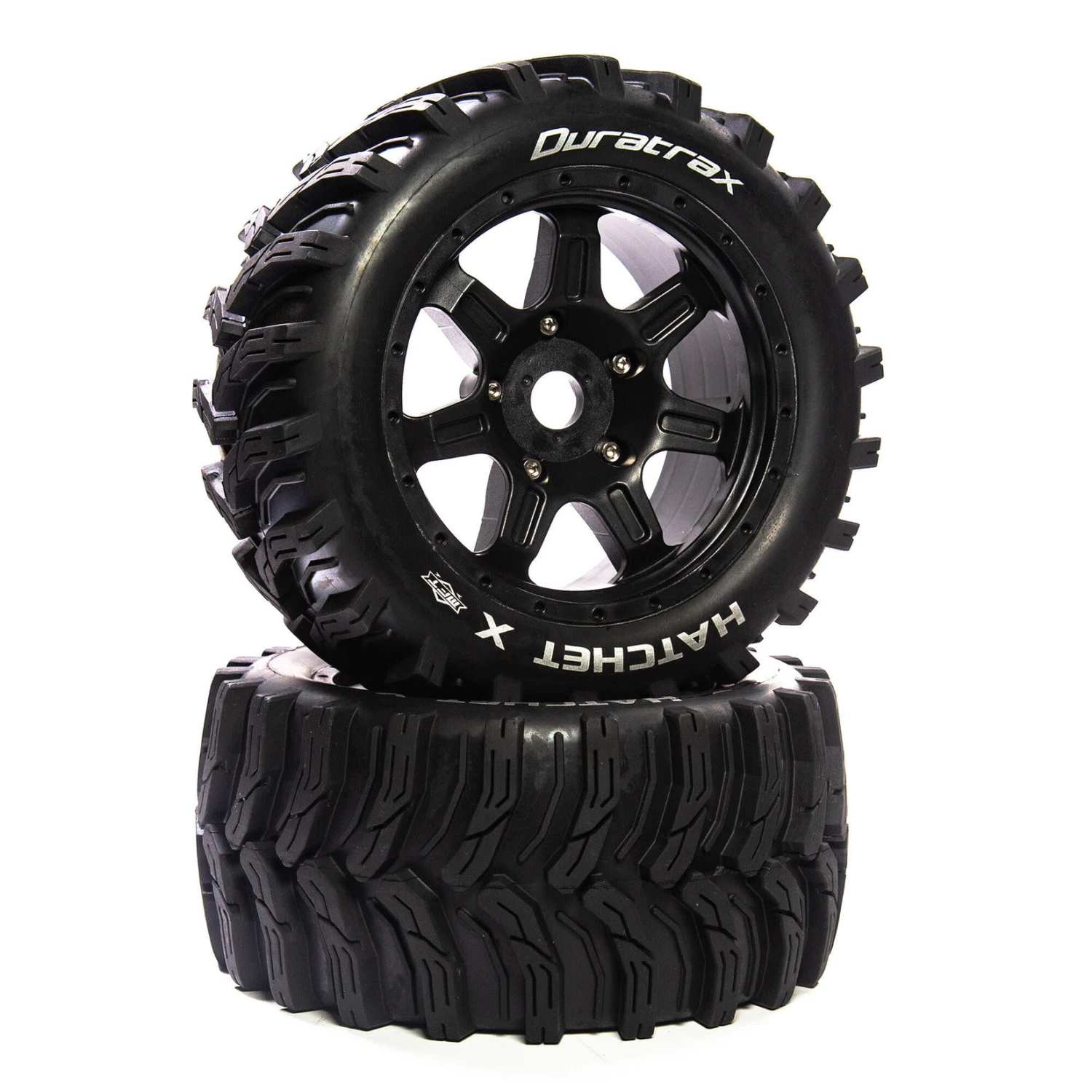 For running on a variety of surfaces Duratrax offers these factory mounted 1/5 scale HATCHET X MT front/rear tires for the ARRMA KRATON 8S monster truck and ARRMA OUTCAST 8S stunt truck. They feature a tread pattern that’s perfect for a wide range of surfaces: pavement; loose dry loamy dirt, loose wet mud, hard-packed wet dirt and grass. Molded from a durable black composite plastic, the 24mm hex wheels measure 3.9 inches (98.2mm) wide and 8.4 inches (212.8mm) in diameter. The belted tires include one-piece foam inserts and are made from medium firm CS Sport compound. Sold in pairs.