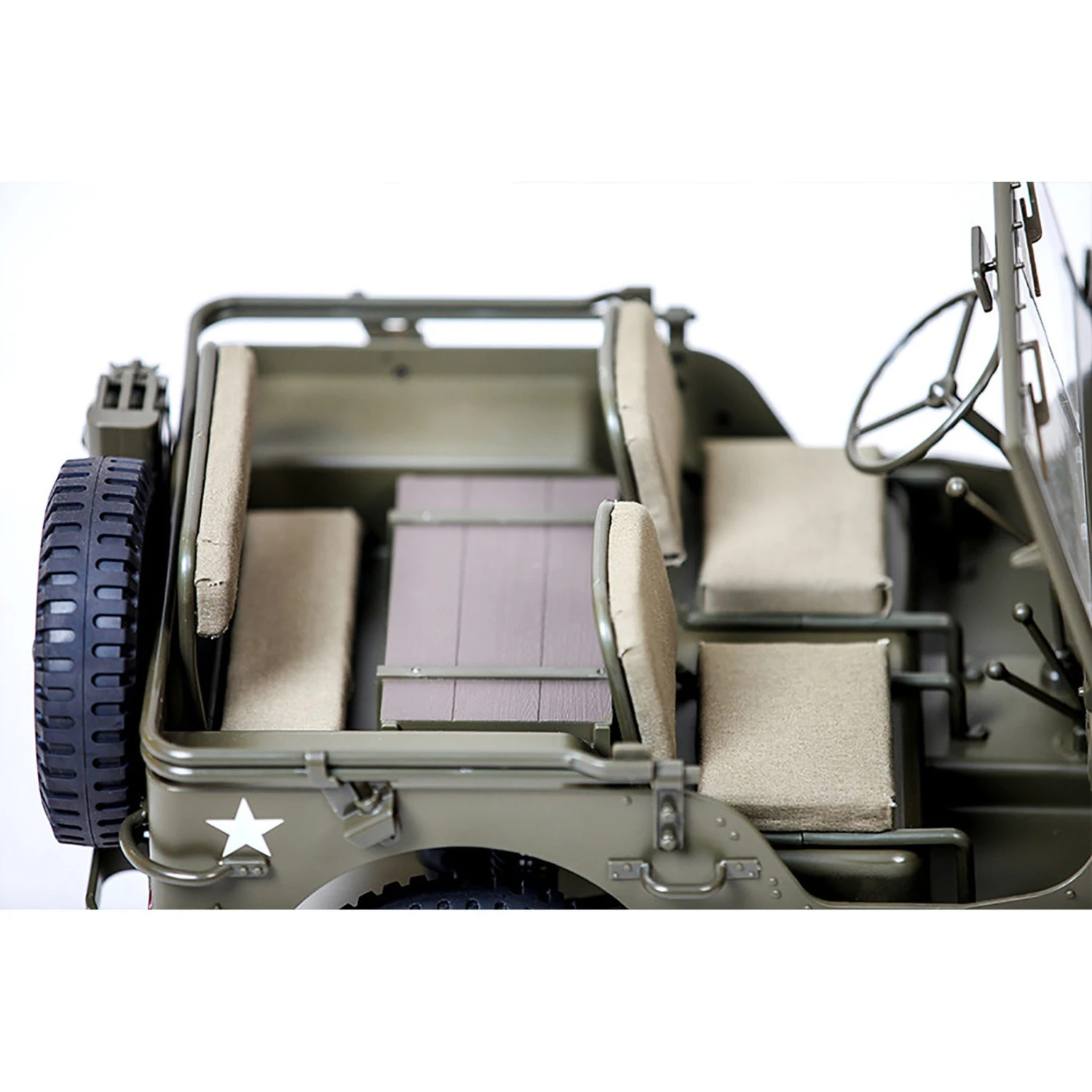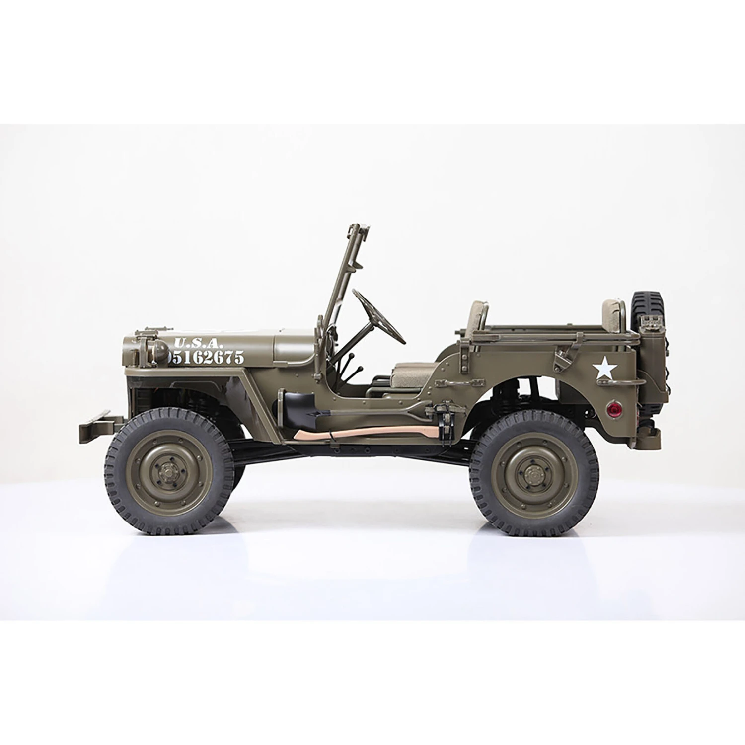 The FMS 1/6 MB Scaler 4WD Ready-to-Run Brushed Rock Crawler is the ultimate choice for scale adventure. This MB is designed after the Willys MB that was produced between 1940 and 1945. This model is painted in the iconic green paint scheme with white decals that matched the trucked used during WWII. No details were left out on this scale truck. The injected molded body features functional LED lights, servo driven steering wheel, painted axe and shovel held by fabric straps, detailed gauges, tilt body for easy access, fold away windshield and much more. Get the FMS MB Scaler and make your own trail.