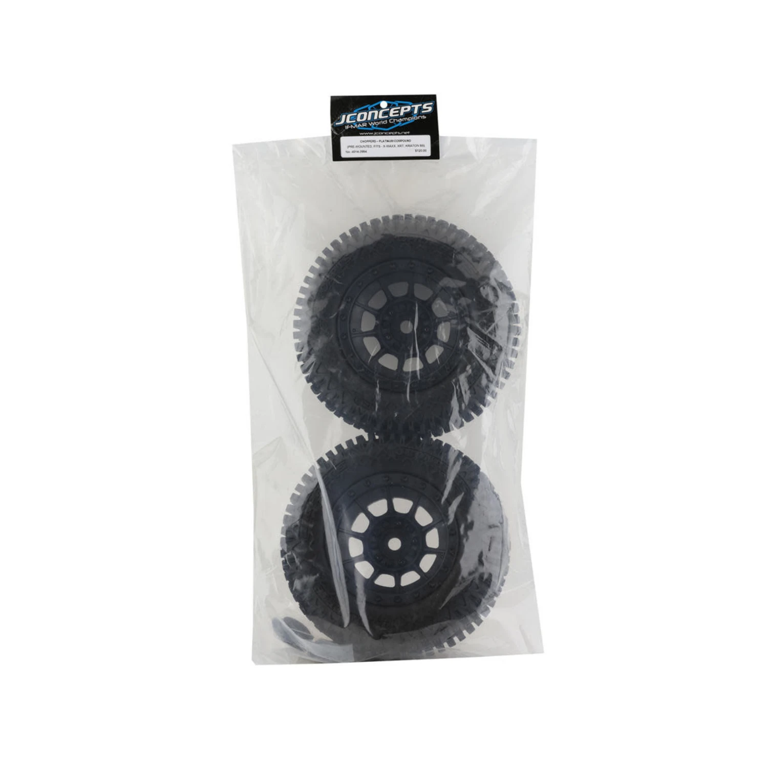 JConcepts Choppers Pre-Mounted Monster Truck Tires with Hazard Wheel. Inspired from some of the most successful JConcepts Racing Tires, the Choppers have the look, fit and finish of a hard-core racing tire built for the best large scale RC vehicles. Whether you are an experienced racer or beginning driver, the Choppers are designed to tear up surfaces ranging from grass and gravel to dirt and asphalt. The tire starts with a robust carcass, capable of holding the weight, heavy inner x-bracing to resist tire expansion and tire beads built in conjunction with Hazard wheels.
