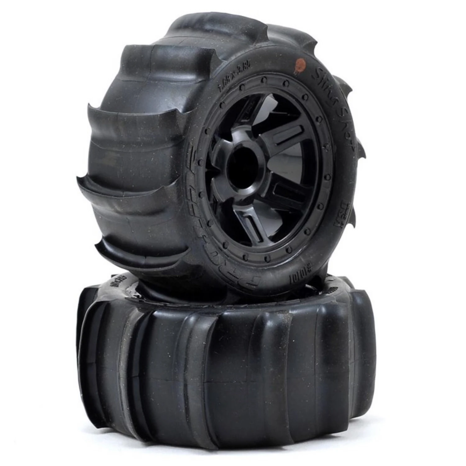 This is a pack of two Pro-Line Sling Shot Tires, Pre-Mounted on Black Desperado Wheels. The Sling Shot provides hours of fun in the sand, snow or even in the occasional mud pit. The 12-paddle design ensures maximum performance due to the true scoop design coupled with low roll outer sidewalls. Plus, Pro-Line makes using high-performance, long-lasting fun tires easier than ever by offering the Sling Shot tires pre-mounted to the Desperado wheels! The wheel features a wider offset, that will make your truck more stable and handle bumps and jumps like a champion. Pro-Line’s 6-spoke Desperado wheel will make your truck the toughest looking one on the block. The wheel is a one-piece wheel made out of extremely durable nylon material and features a molded in bead-loc ring for an awesome scale look. This is a 12mm hex wheel and it will make your truck stand out from the rest!
