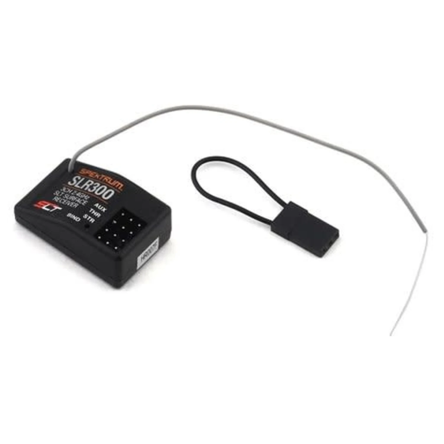 This is a Spektrum RC SLR300 3-Channel SLT Receiver Single Protocol. Specifications: Type: SLT Single Protocol Surface Receiver # of Channels: 3 Modulation: FHSS Band: 2.4 GHz Length: 33.4mm Width: 21mm Height: 12.6mm Weight: 6g Voltage Range: 3.5–9.6V Antenna Length: 140mm