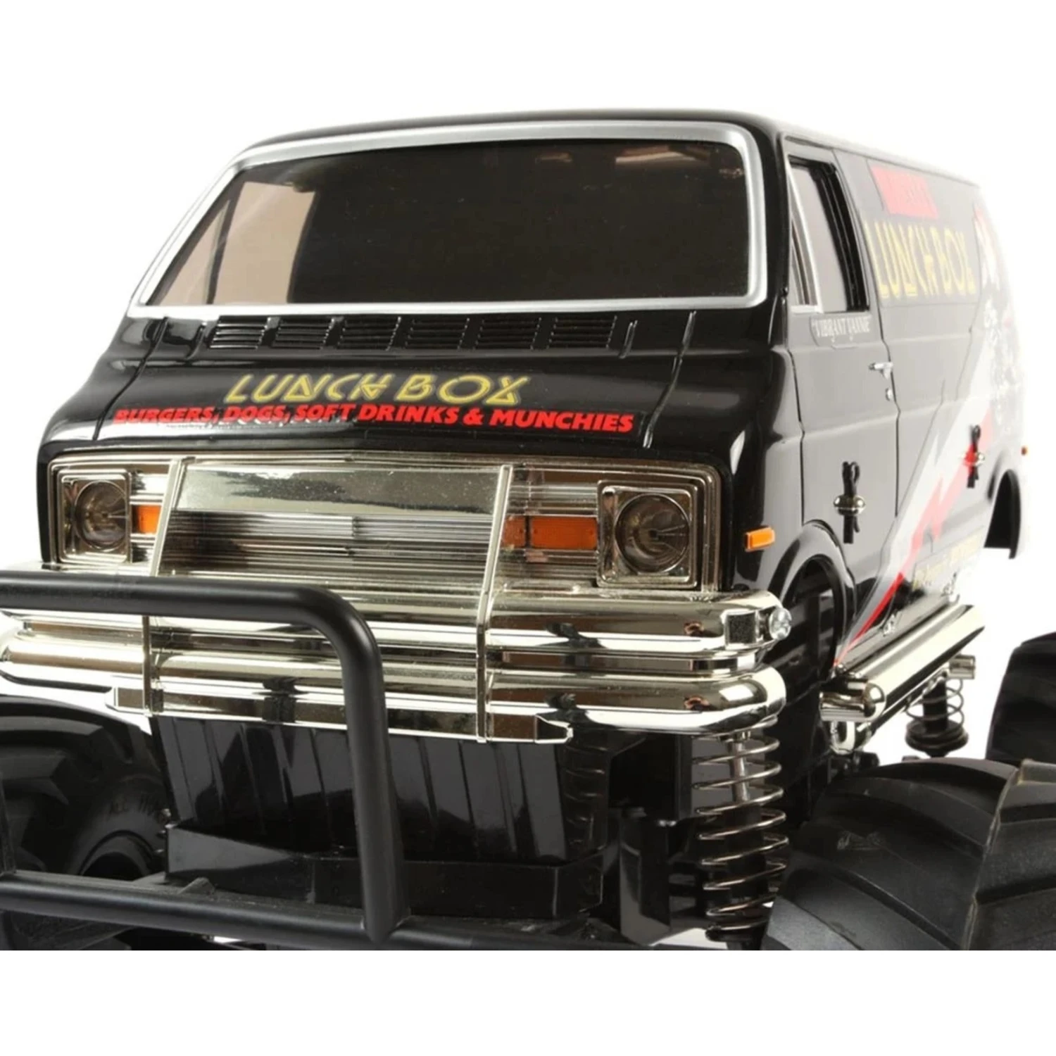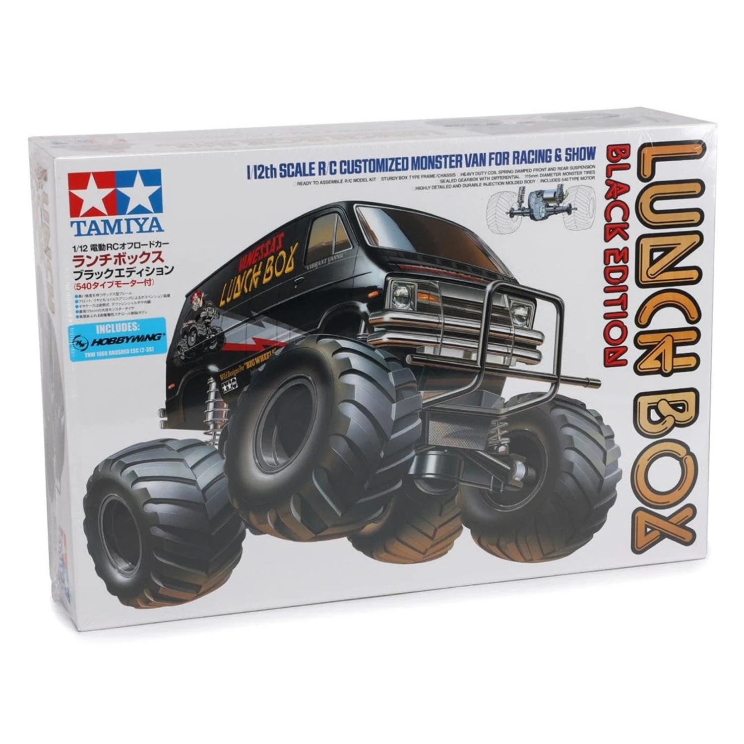 The Tamiya Lunch Box “Black Edition” 2WD Electric Monster Truck Kit is a black variant of the ever popular 1/12 scale R/C Lunch Box van. This model features a stylish combination of a Black ABS molded body and chrome-plated wheels. The R/C Lunch Box (first released in 1987) was loved for its camp appearance as much as for its R/C performance. The boxy minivan body is raised up over the monster truck wheels to ensure that this R/C van will get attention anywhere you choose to drive it.