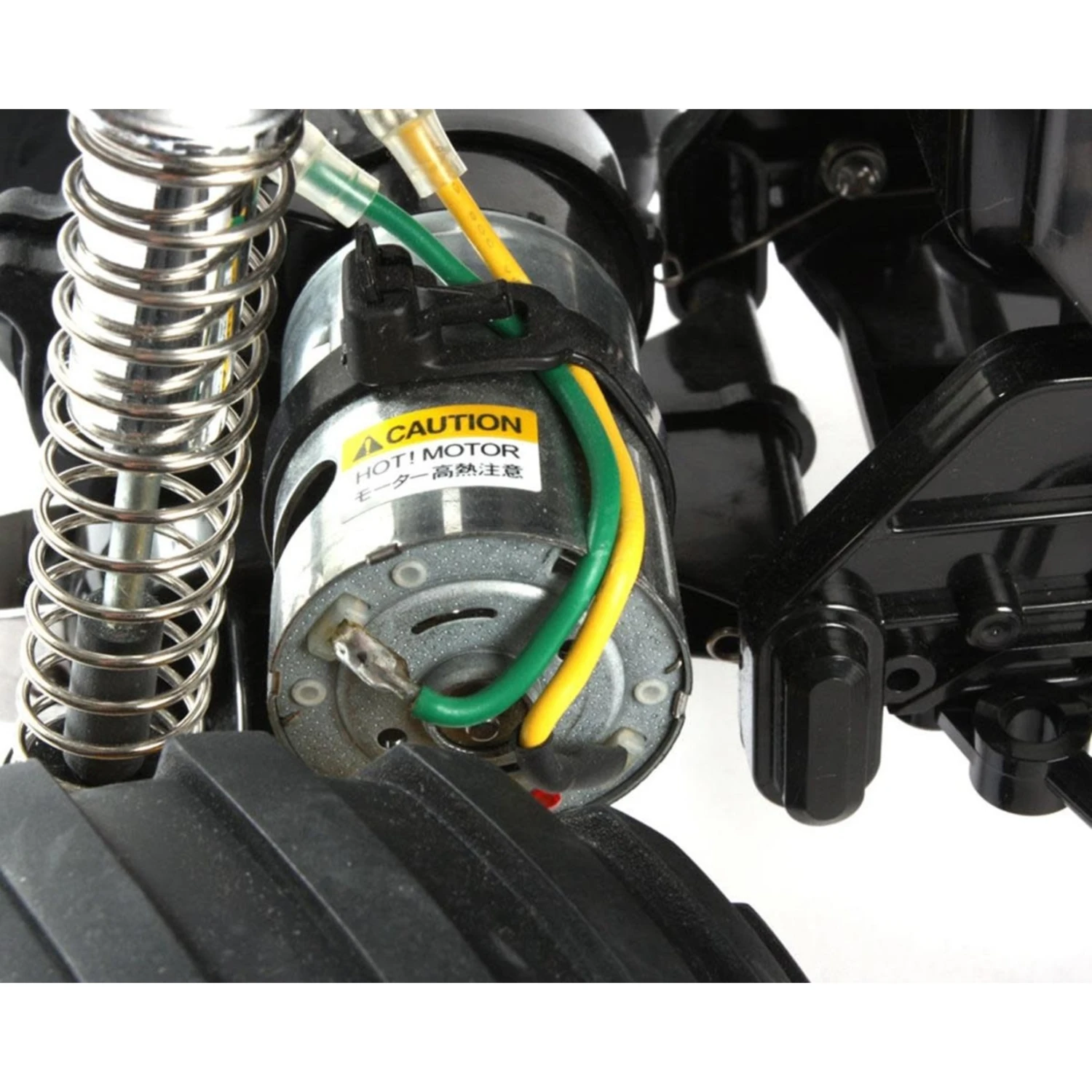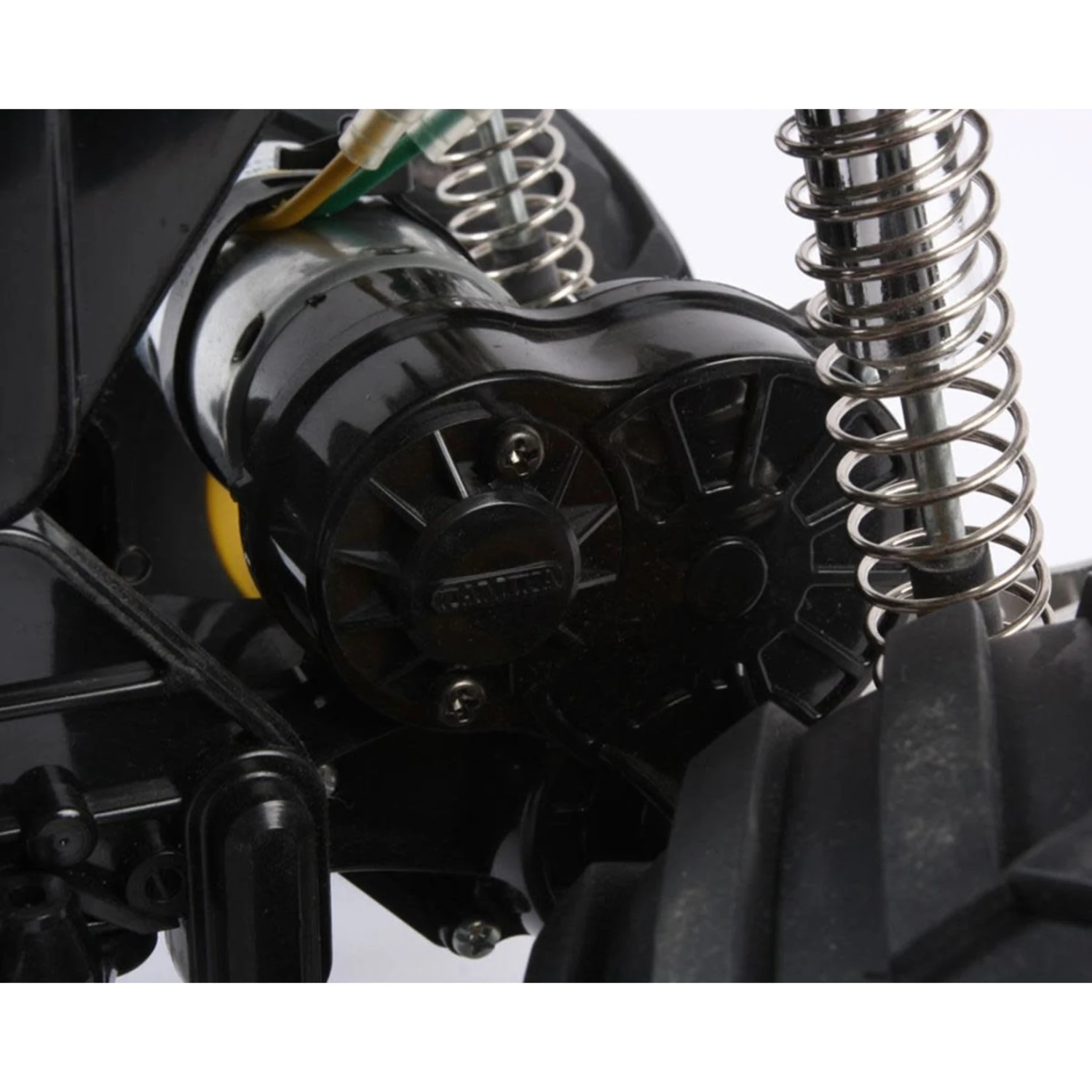 The durable and easy-to-assemble 2WD chassis employs a box type frame and features front independent swing arms and a rear rolling rigid suspension. Big 115mm diameter tires offer dynamic running on even the toughest of surfaces. The sealed gearbox protects the differential gears from dirt and sand during off-road driving. Rear mounted wheelie bar enables wild stunt driving.
