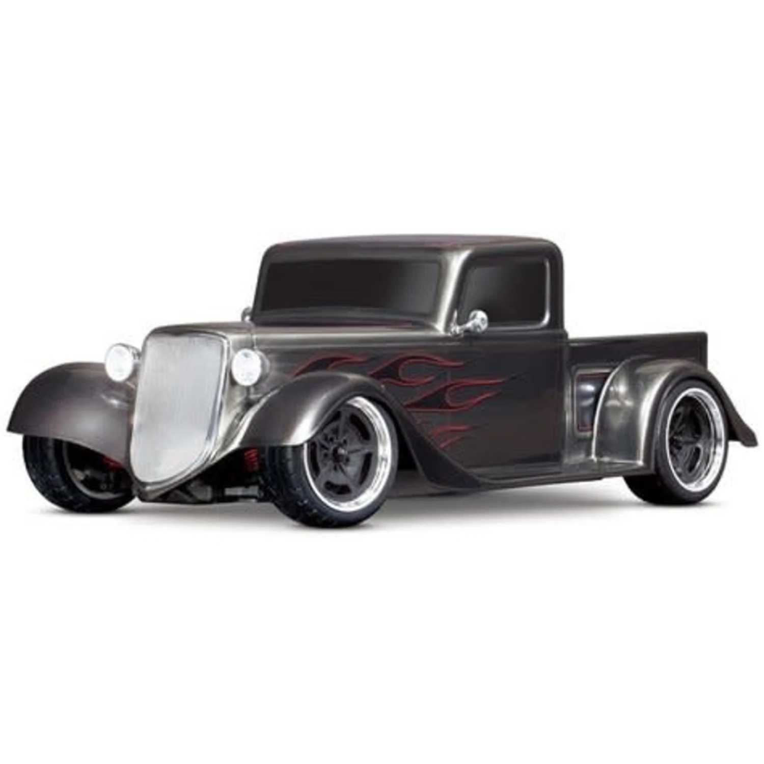 The Traxxas 4-Tec 3.0 1/10 RTR Touring Car with Factory Five ’35 Hot Rod Truck Body gets its styling from the early days of hot rods. The 4-Tec 3.0 chassis features a three-hundred millimeter wheelbase that has been equipped with low profile suspension. This is what allows for the deep-cut body lines seen on this model. Using a modular platform, this hot rod offers extreme handling and endless tuning potential. The body of this hot rod uses a deep silver finish, detailed graphics, narrow hood design and an aggressive chopped roof. Chrome headlights, grill and side mirrors are included to add to the classic feel of this hot rod. LED head lights and tail lights are waterproof and installed for a perfect fit and finish. Clipless body mounts are used so that no holes are drilled into this stunning body. This hidden mechanism delivers a secure hold, and releases in seconds to provide chassis access.