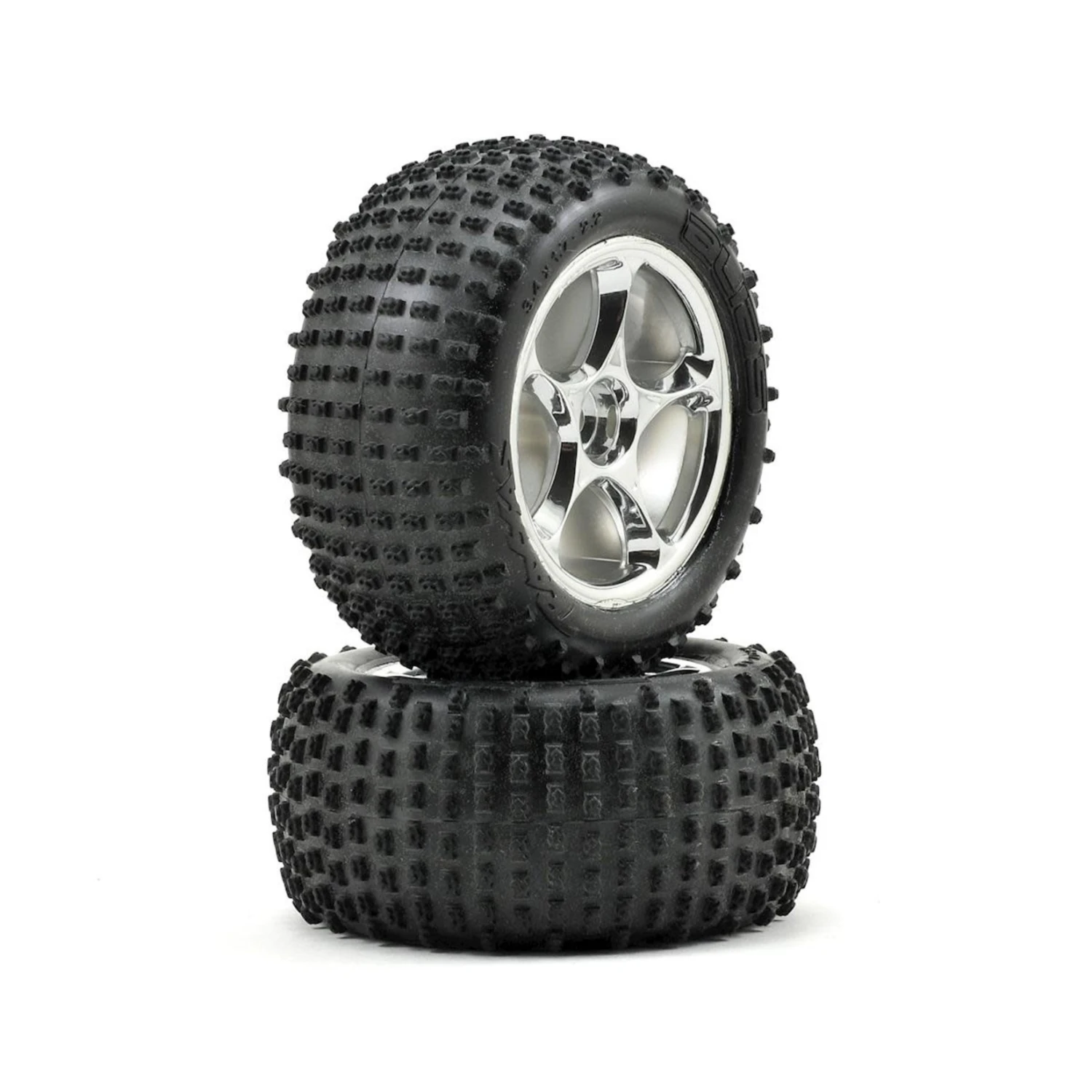 This is a set of two Traxxas Rear Alias Tires, pre-mounted on Tracer 2.2″ Wheels, and are intended for use with the Traxxas Bandit. Whether racing on a track or tearing across a back lot, Alias tires are the perfect choice. The Alias features a non-directional design for no-hassle, no-worry mounting. The Alias rear tires integrate a rounded carcass and dual pin design that steps-up to keep the tires firmly planted on extreme off-road terrain. This tire combination is ideal for use on grass, loamy dirt, sand, and any other loose surface. The Alias tire is molded in a super soft rubber compound that supplies exceptional grip on asphalt and other hard packed surfaces. The Alias is a versatile tire that is at home on the track or in the backyard. Choose from Chrome, or Black Chrome Tracer wheels.