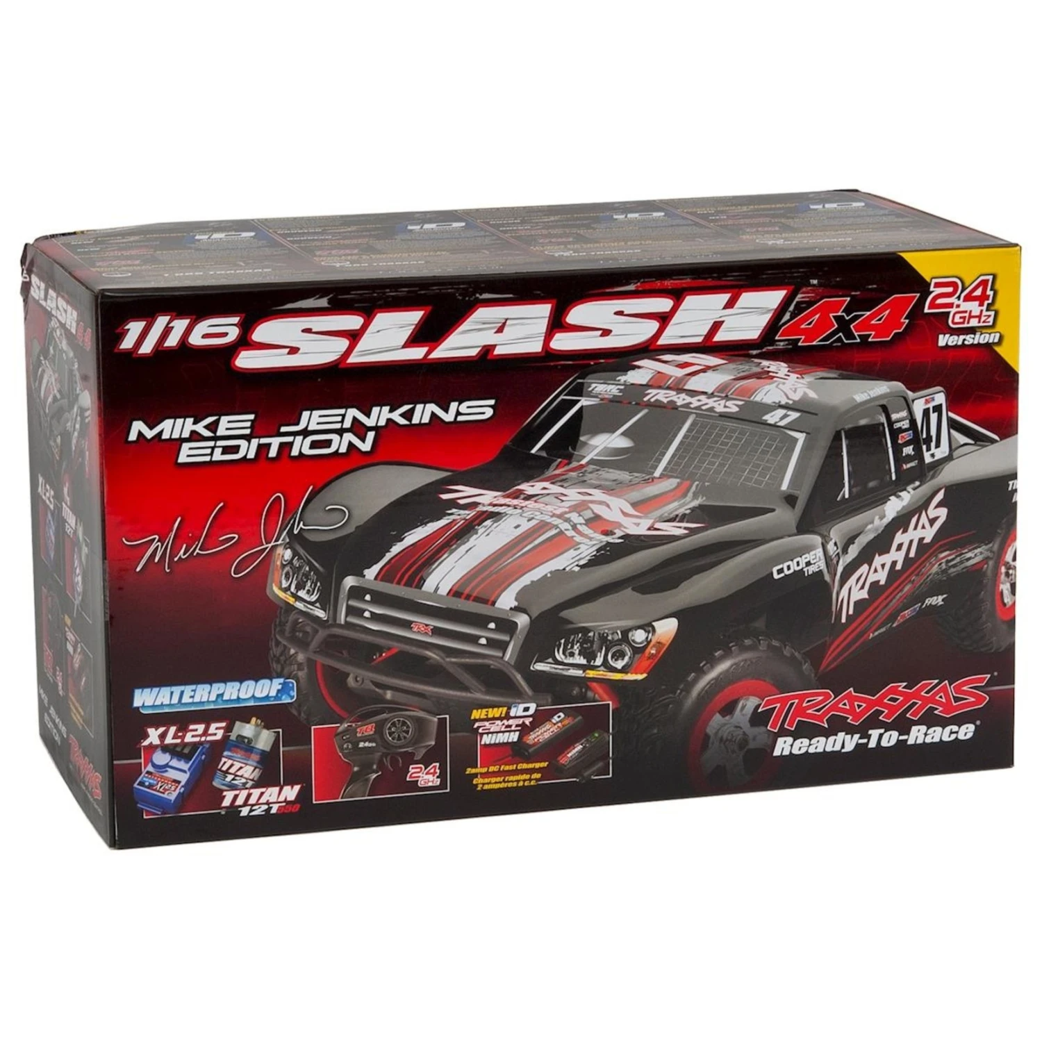 - Race Replica Painted Bodies: No need for a paint or sticker session; 1/16 Slash 4X4 rolls out of the box ready for action with a factory-finished and mounted Race Replica body and decals already applied for you, so its Ready-to-Race. Traxxas 1/16 Slash 4X4 is available in four Race Replica versions: Mike Jenkins (Traxxas #47), Mark Jenkins (Traxxas #25), Scott Douglas Edition (Amsoil), and Greg Adler (4 Wheel Parts).